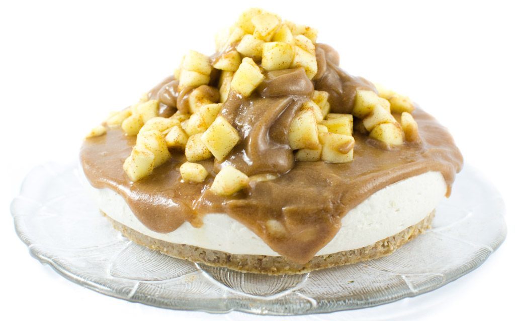 Die Torte herausnehmen und vorsichtig aus dem Tortenring befreien. Die Karamellsauce darübergeben und mit den Äpfeln anrichten.
