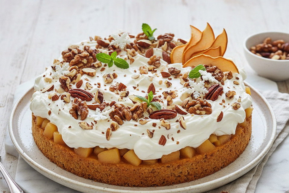 Vegane Schneeflöckchen Torte mit Quitten, Birnen und karamellisierten Nüssen