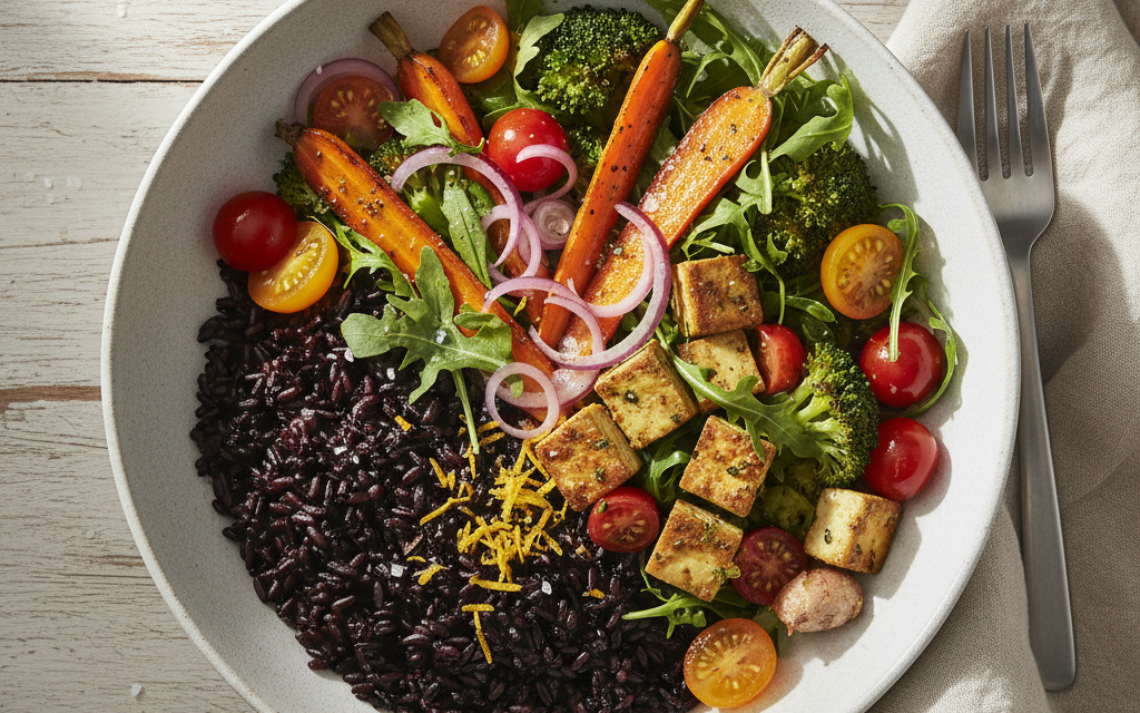 Bunte Vegane Gemüse-Bowl mit schwarzem Reis
