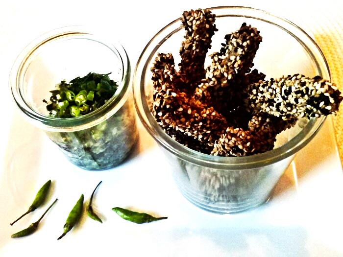 - Die Seitanstreifen darin wenden und dann mit der Sesam-Kümmel Mischung panieren.