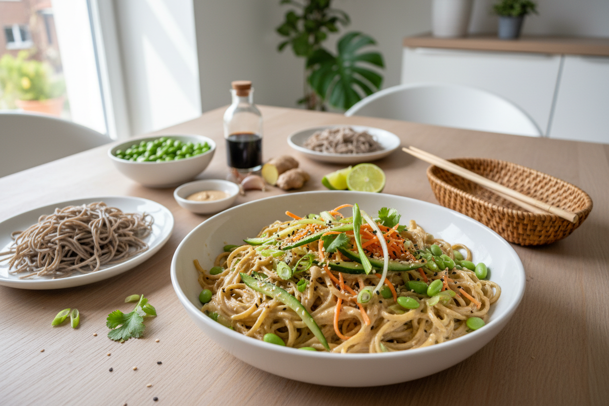 Vegane Sesam-Nudeln sind eines der schnellsten und befriedigendsten Gerichte der pflanzlichen Kueche. Die cremige Tahini-Ingwer-Sosse ist in wenigen Minuten zusammengeruehrt - ganz ohne Herd. Zusammen mit knackiger Gurke, suesser Karotte und proteinreichem Edamame entsteht ein Gericht, das genugsam und frisch zugleich ist.