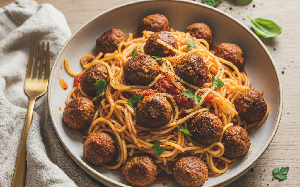 Vegane Spaghetti-Kürbis mit Soja-Bällchen