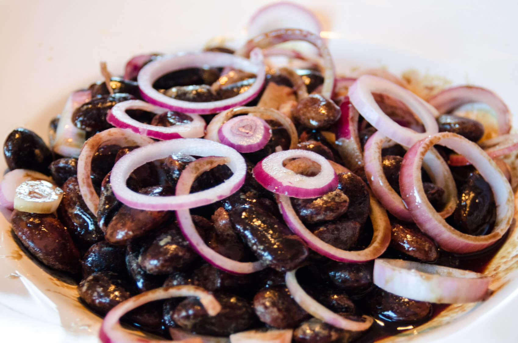 Mit den Zwiebeln in eine Salatschüssel geben und mit reichlich Kürbiskernöl, Apfelessig und Salz anmachen. Am besten etwas ziehen lassen. Mit dunklem Brot servieren.