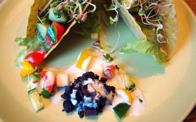Vegane Tacos mit Guacamole und schwarzem Bohnenpüree