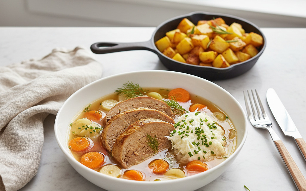 - Seitan aus Brühe nehmen, in Scheiben schneiden. Mit Brühe übergießen, gekochtes Gemüse garnieren. Mit Apfelkren, Schnittlauchsauce und Rösterdäpfeln servieren.
