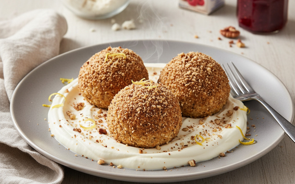 Tofu ist ein echtes Multitalent in der veganen Küche – auch für süße Gerichte! Bei diesen fluffigen Knödeln sorgt weicher Naturtofu für eine wunderbar lockere Konsistenz, während die knusprige Nuss-Zimt-Panade für den perfekten Kontrast sorgt. Serviert auf einem cremigen Sauerrahm-Spiegel mit fruchtigen Marmelade-Tupfern wird dieses Dessert zum absoluten Highlight.