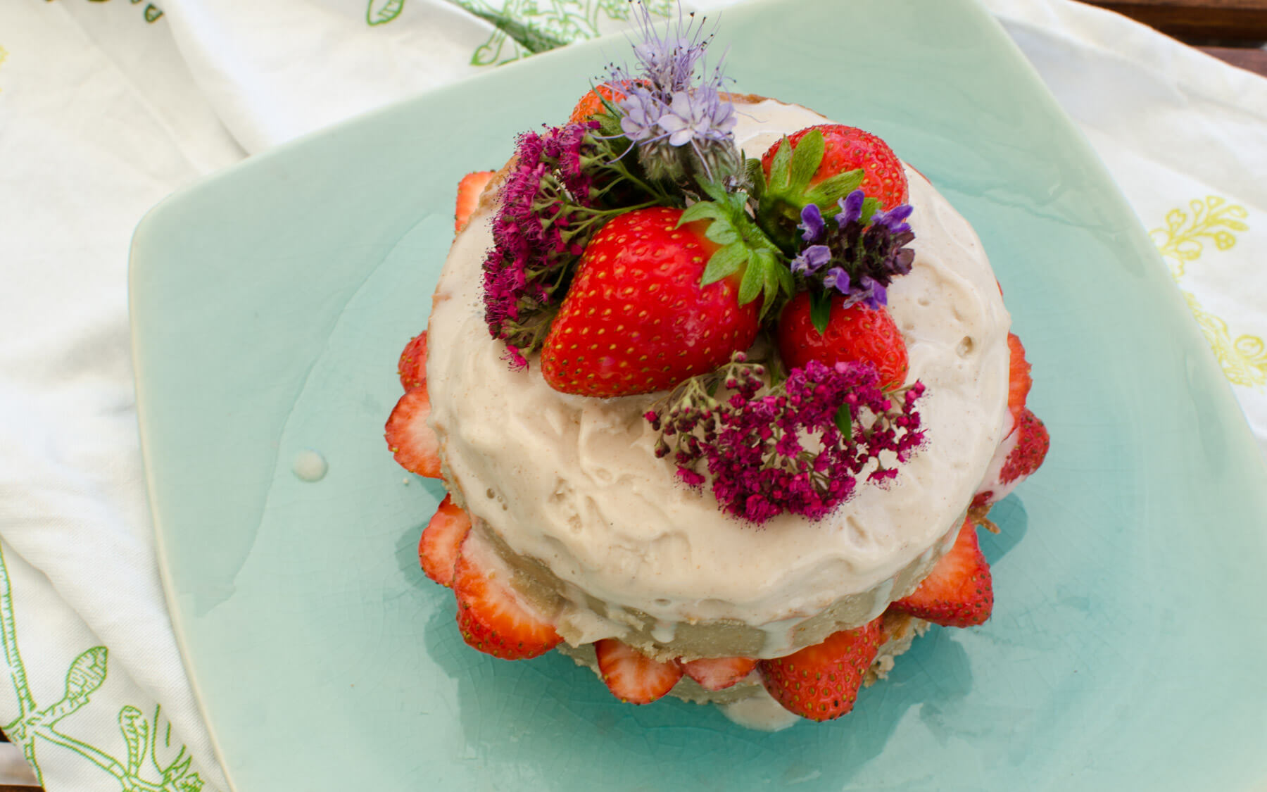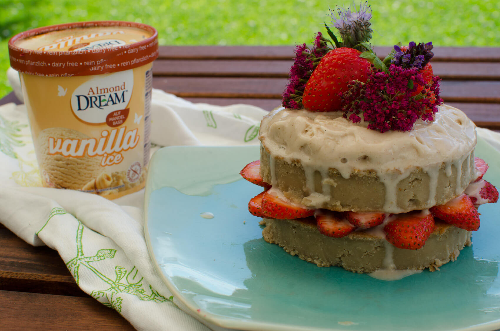 Aus der Form nehmen, in der Mitte durchschneiden. Das Eis für min. 10min antauen lassen. Die Erdbeeren waschen, entstielen und längs in Scheiben schneiden. Den Kuchen damit belegen, eine Schicht Eis darauf geben und die zweite Kuchenhälfte darauf setzen. Obendrauf noch mal Eis verteilen und mit Früchten und Blüten dekorieren. Schnell genießen!