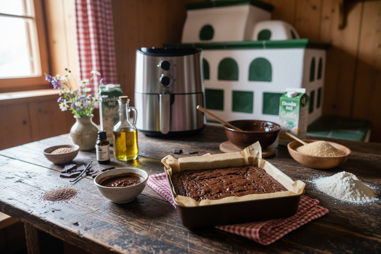 Der Airfryer heizt schnell auf und verteilt Heissluft gleichmassig um die Backform - das sorgt fur eine knusprige Kruste oben und eine cremig-weiche Mitte unten. Genau das macht einen guten Brownie aus: der Kontrast zwischen der leicht crunchigen Oberseite und dem weichen, fast schmelzenden Kern.