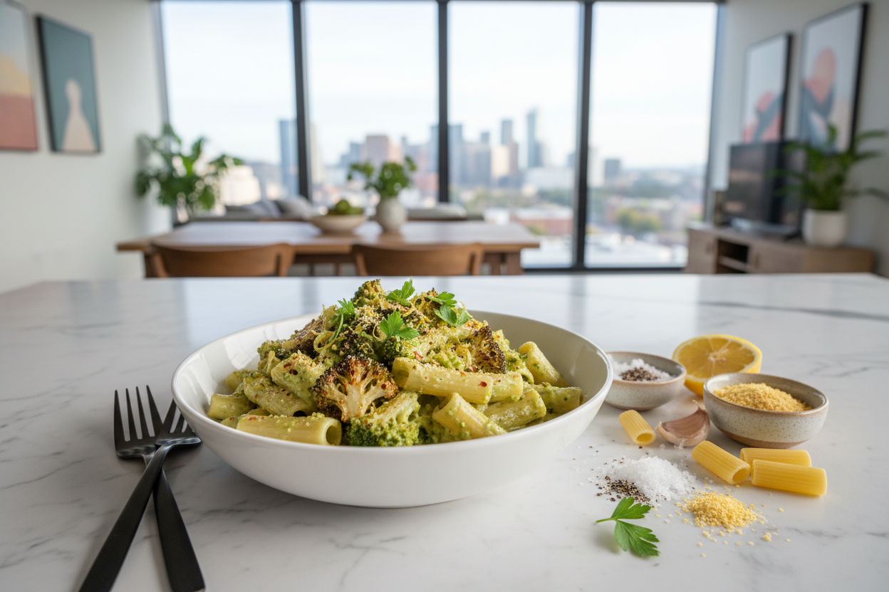 - Die Zwei-Wege-Technik gibt der Pasta Tiefe: Der weich gekochte Brokkoli wird in die Sauce gedruckt und sorgt fur Cremigkeit und naturliche Sussigkeit. Die scharf angebratenen Roschen obendrauf liefern Biss, Rostaromen und eine ansprechende Optik. Beide Texturen erganzen sich perfekt.