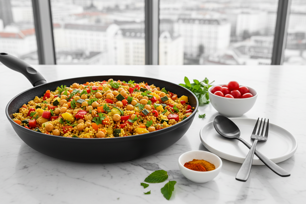 Eine Couscous-Pfanne ist die Antwort auf alle schnellen Abendessen-Fragen. In einer einzigen Pfanne entsteht in nur 25 Minuten ein farbenfroher, aromatischer Teller, der wirklich sättigt. Die Kombination aus weichen Kichererbsen, buntem Sommergemüse und fluffigem Couscous macht dieses Rezept zu einem echten Lieblingsgericht für die ganze Woche.