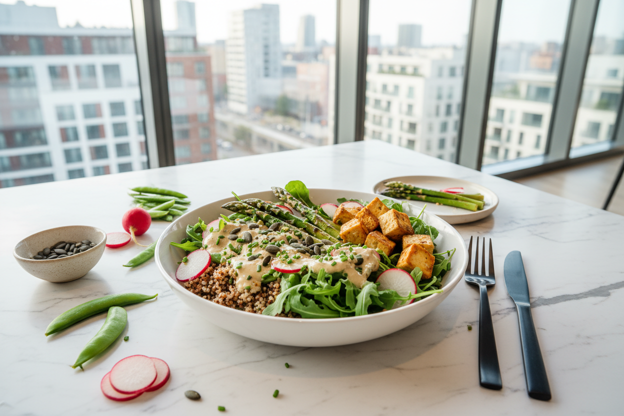 Der Frühling ist endlich da – und mit ihm das erste knackige Gemüse der Saison. Diese Frühlings-Bowl vereint alles, was März und April zu bieten haben: grüner Spargel, Zuckerschoten, Radieschen und ein Hauch frischer Kräuter. Das Herzstück ist ein cremiges Tahin-Kürbiskern-Dressing, das mit einem österreichischen Touch (Kürbiskernöl!) den Unterschied macht.