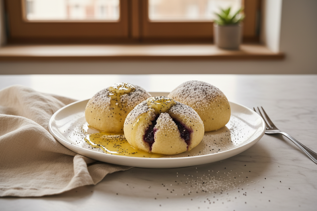 Klassisch werden Germknödel mit Mohnzucker und zerlassener Butter serviert. Manche mögen auch Vanillesauce dazu – das macht sie noch cremiger!