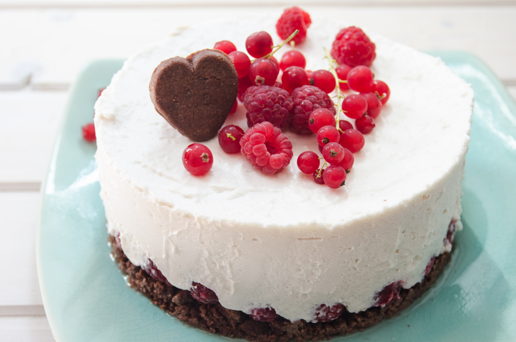 Den Boden mit Himbeeren belegen, die Sahne darauf verteilen und glatt streichen. Für min. 3h kalt stellen.