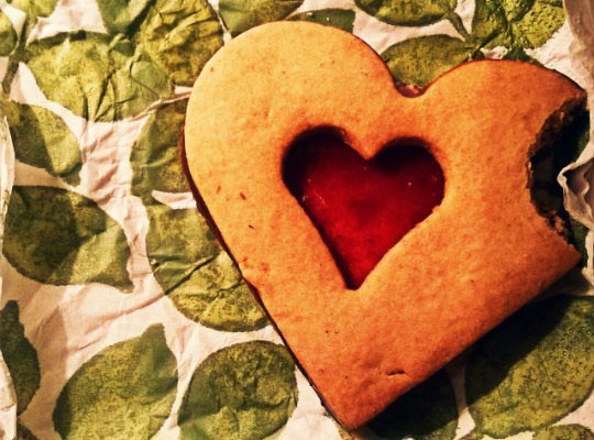 Zwischen zwei Schichten Backpapier ausrollen und Herzen ausstechen, aus der Hälfte der Kekse noch innen ein kleineres Herz ausstechen und auf ein Blech mit Backpapier setzen.