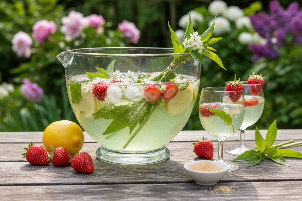 - Sofort in Glaeser schoepfen und mit einem frischen Waldmeisterzweig oder einer Erdbeere garnieren.