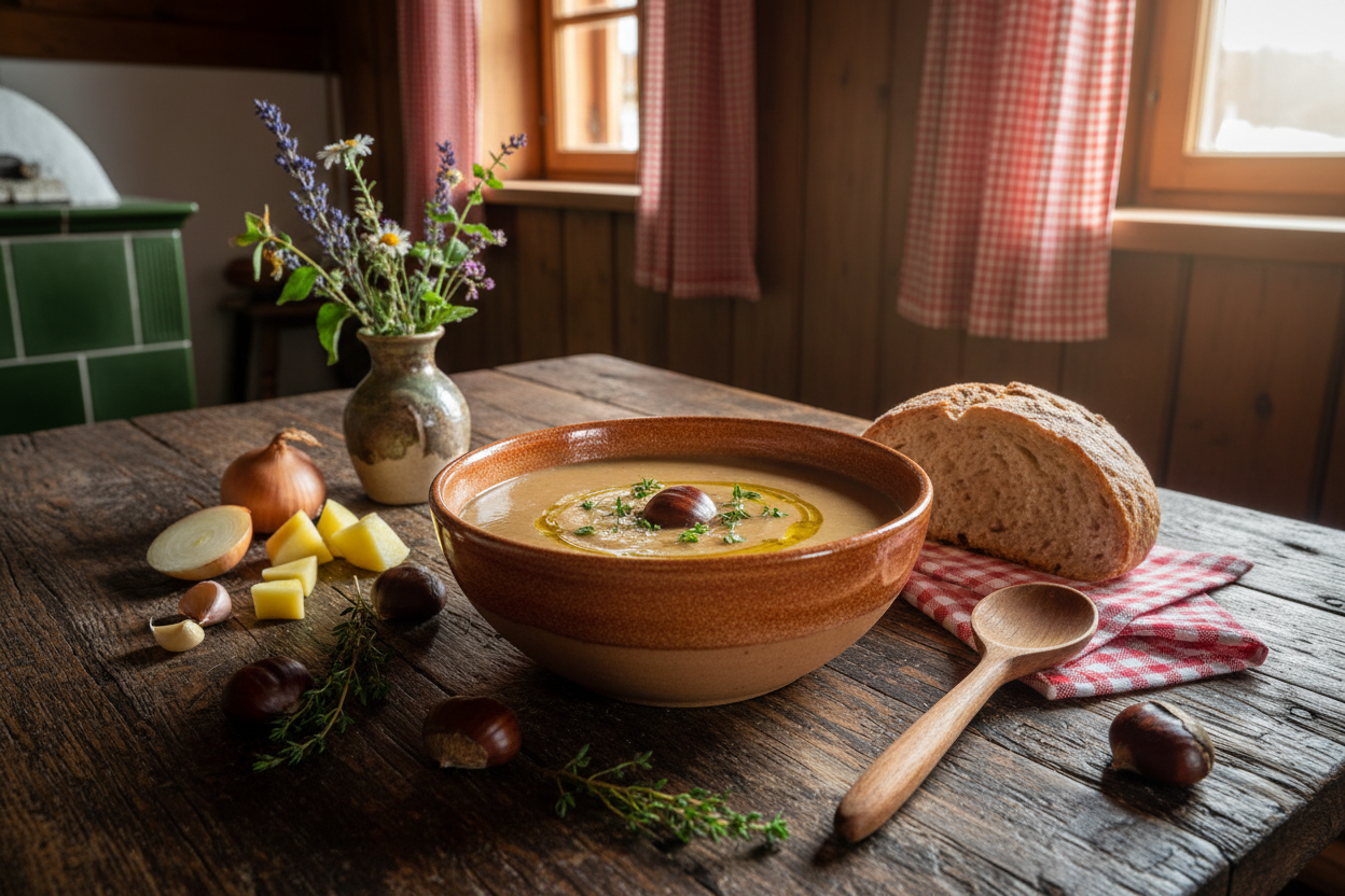 In Frankreich gehört die "Soupe aux châtaignes" oder "Velouté de châtaignes" zum traditionellen Herbst- und Winterrepertoire. Die natürliche Süße der Maronen braucht keine aufwendigen Gewürze – Thymian, Muskatnuss und eine Prise Salz genügen, um den vollen Geschmack zur Geltung zu bringen.