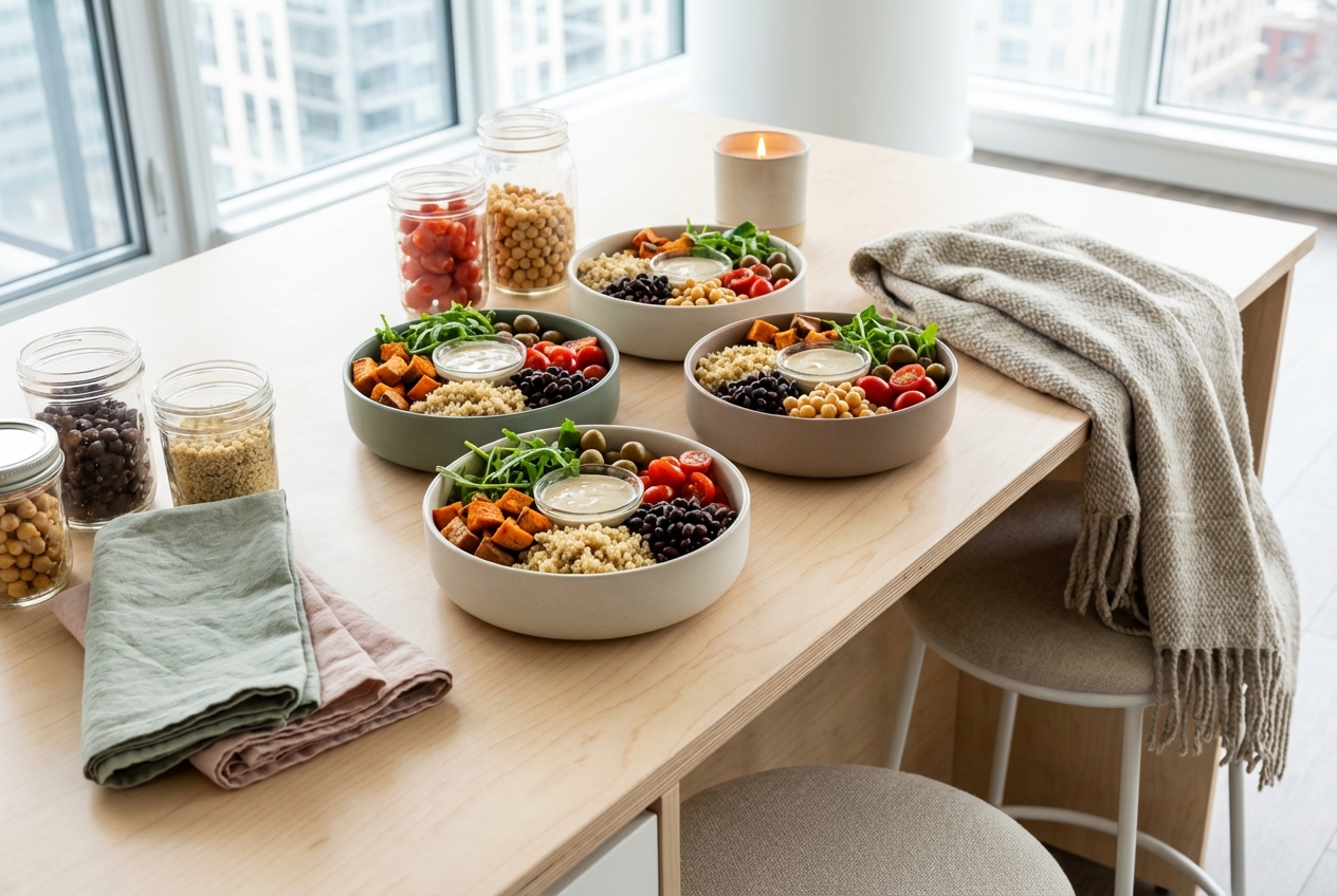 - Bowls zusammenstellen: In 16 Meal-Prep-Behälter aufteilen - pro Bowl eine Getreide-Basis, Proteinquelle, geröstetes und rohes Gemüse. Dressing separat aufbewahren.