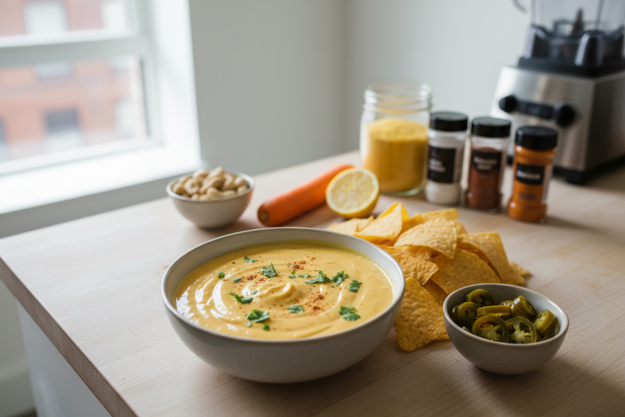 Selbstgemachte vegane Käsesauce für Nachos – cremig, goldgelb und mit einer würzig-rauchigen Tiefe, die süchtig macht. Die Kombination aus eingeweichten Cashews und weich gekochter Karotte ergibt eine wunderbar samtige Konsistenz, während Hefeflocken, geräuchertes Paprikapulver und Senf für den typischen Käse-Umami-Geschmack sorgen.