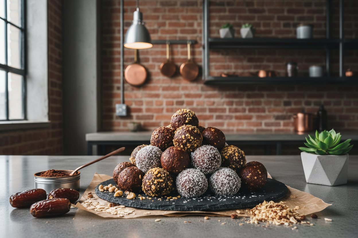Alles im Mixer zu einer klebrigen Masse verarbeiten, zu Kugeln formen, kühlen. Kein Ofen, keine komplizierten Zutaten. Der natürliche Kleber sind die Medjool-Datteln - sie halten alles zusammen.