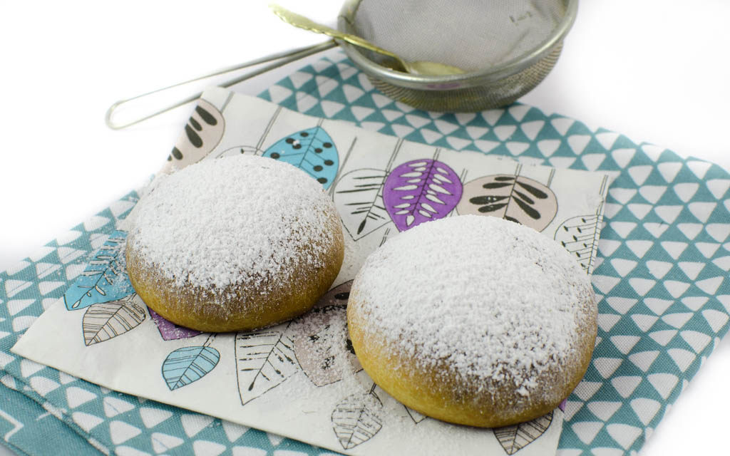 - Die Krapfen auskühlen lassen, mit einer Spritztülle die Füllung einspritzen und großzügig mit Staubzucker bestäuben.