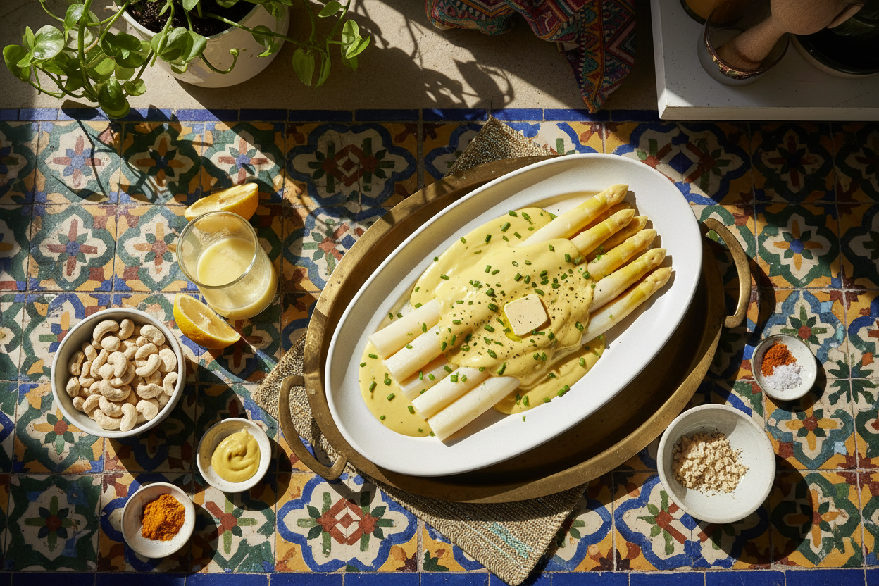 Das Herzstück des Rezepts sind eingeweichte Cashewkerne. Sie geben der Sauce eine unglaublich samtige Textur und eine natürliche Reichhaltigkeit, die perfekt zur Frühlingsküche passt. Die besondere Zutat ist Kala Namak - ein indisches Schwarzsalz, das dem Ganzen einen warmen, runden Geschmack verleiht, wie man ihn von klassischer Hollandaise kennt.