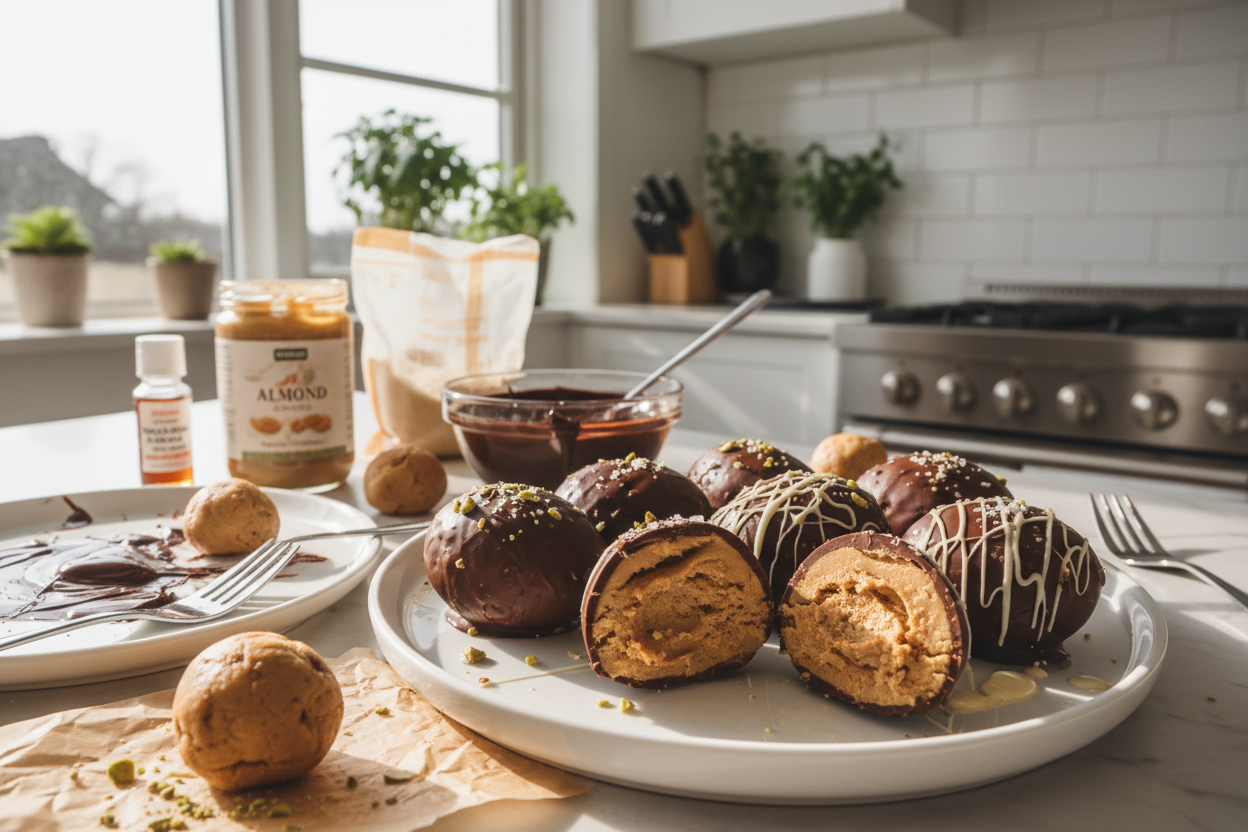 Füllung fest einfrieren: Dieser Schritt ist entscheidend. Gut gefrorene Füllungs-Eier nehmen die Schokolade gleichmäßig auf und verhindern, dass die Masse beim Überziehen auseinanderfällt.