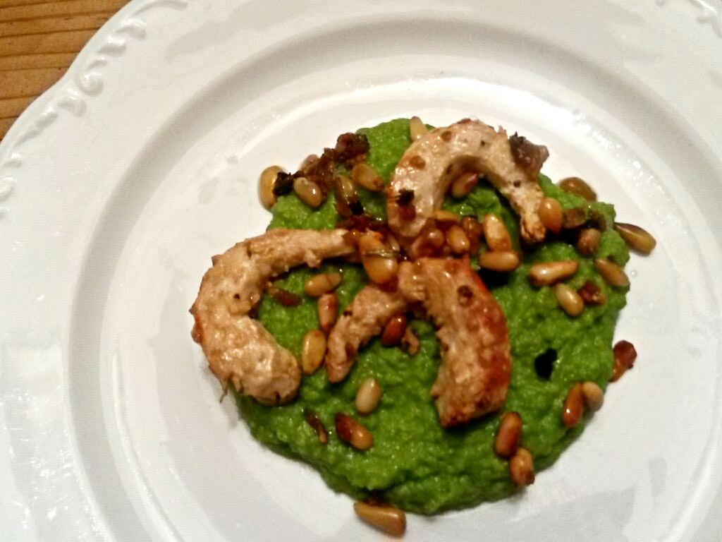 Die gefrorenen Erbsen in einen Topf geben, etwas Wasser dazu, würzen und köcheln bis sie aufgetaut und weich sind. Mit dem Stabmixer pürieren und nochmal abschmecken.