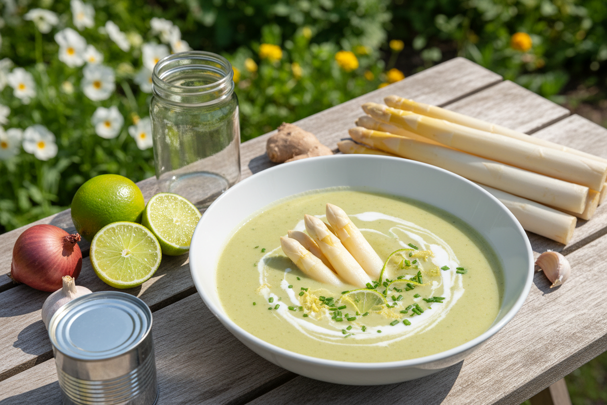 Wenn weißer Spargel auf den Frühjahrsmärkten erscheint, ist das der beste Anlass für diese samtig-cremige Spargelsuppe mit Kokosmilch. Die Kokosmilch bringt eine natürliche Reichhaltigkeit, ein Hauch Ingwer und Limettensaft sorgen für frische Tiefe - das Ergebnis ist eine Suppe, die nach Frühling schmeckt.