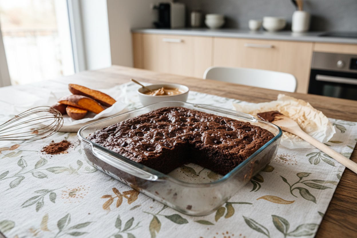 Drei Faktoren entscheiden, ob Brownies fudgig oder trocken werden: Fett, Feuchtigkeit und Backzeit. Bei dieser veganen Version übernimmt die Süsskartoffel die Feuchtigkeitsrolle (normalerweise von Eiern), das Mandelmus liefert das Fett, und das bewusste leichte Untergaren sorgt für die dichte Konsistenz.