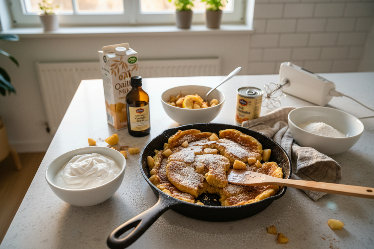 - Hafermilch ist die erste Wahl wegen ihres milden, leicht süsslichen Geschmacks und der cremigen Konsistenz. Auch Mandelmilch oder Sojamilch funktionieren gut. Kokosmilch aus der Dose macht den Teig schwerer und verändert das Aroma stark - besser zur Vollmilch aus der Packung greifen, wenn man Kokosnote möchte.