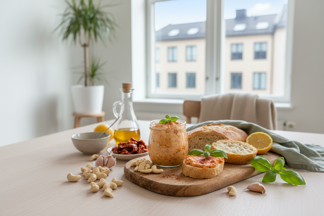 Dieser cremige Aufstrich aus Cashews und getrockneten Tomaten ist ein echter Allrounder: perfekt aufs Frühstücksbrot, als Dip für eine Jause oder als schnelle Vorspeise für Gäste. Die Kombination aus dem intensiven Tomatengeschmack und dem rauchigen Paprika macht ihn unwiderstehlich.