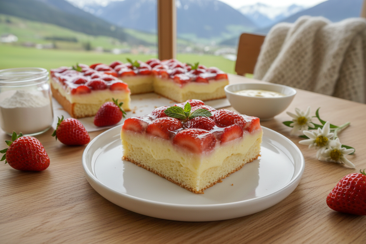 Österreichische Erdbeeren haben von Ende April bis Juli Saison, mit dem Höhepunkt im Juni. Für diesen Blechkuchen lohnen sich regionale Früchte vom Markt oder direkt vom Bauernhof – der Geschmack ist unvergleichlich intensiver als bei importierten Sorten. Wer den Kuchen bereits jetzt im Frühling ausprobieren möchte, findet in gut sortierten Supermärkten und auf dem Wiener Naschmarkt hochwertige frühe Erdbeeren aus Spanien oder Italien.