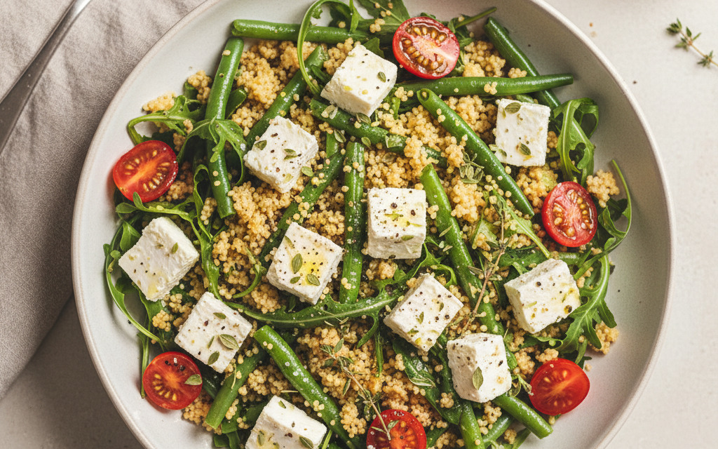 Veganer Feta auf Rucola-Bohnen-Couscous Salat