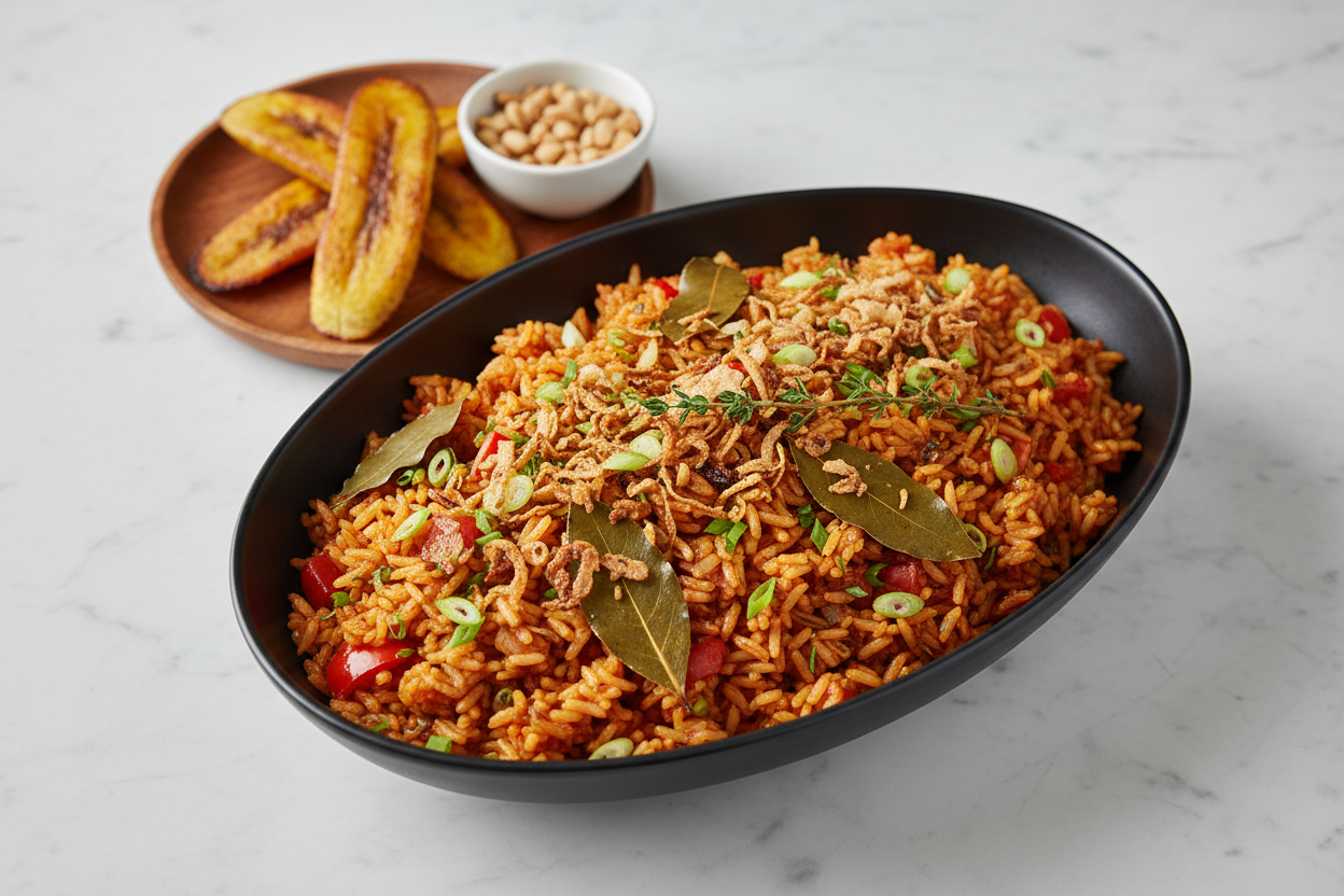 In Westafrika wird Jollof-Reis gerne mit gebratenen Kochbananen (Dodo) und einem frischen Krautsalat serviert. Probieren Sie auch unsere vegane Erdnusssuppe als Vorspeise - eine perfekte westafrikanische Kombination!