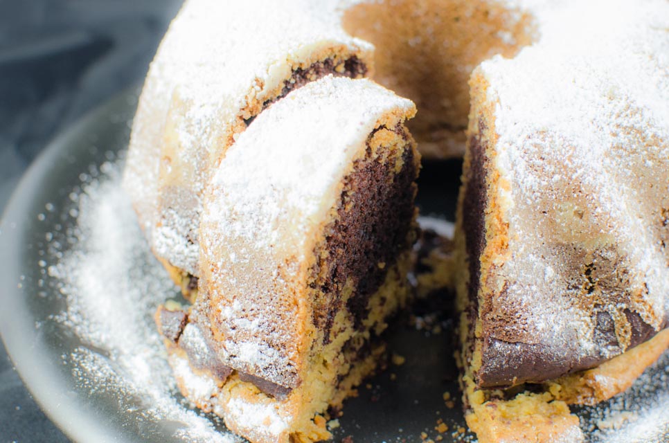 Die andere Hälfte des Teigs mit den Zutaten für den dunklen Teig noch mal mixen und auch in die Form geben. Mit einer Gabel durch den Teig fahren, um das typische Marmormuster zu zeichnen.