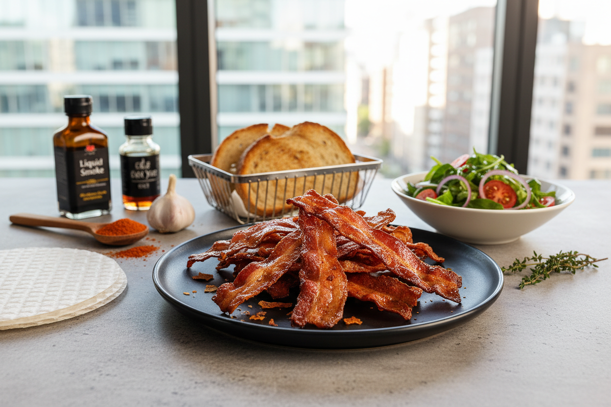 Veganer Bacon aus Reispapier ist eine echte Offenbarung! Die Textur wird unglaublich knusprig, das Raucharoma macht ihn würzig-rauchig, und er sieht tatsächlich aus wie echter Speck. Perfekt für BLT-Sandwiches, Salate, Burger oder einfach zum Snacken.