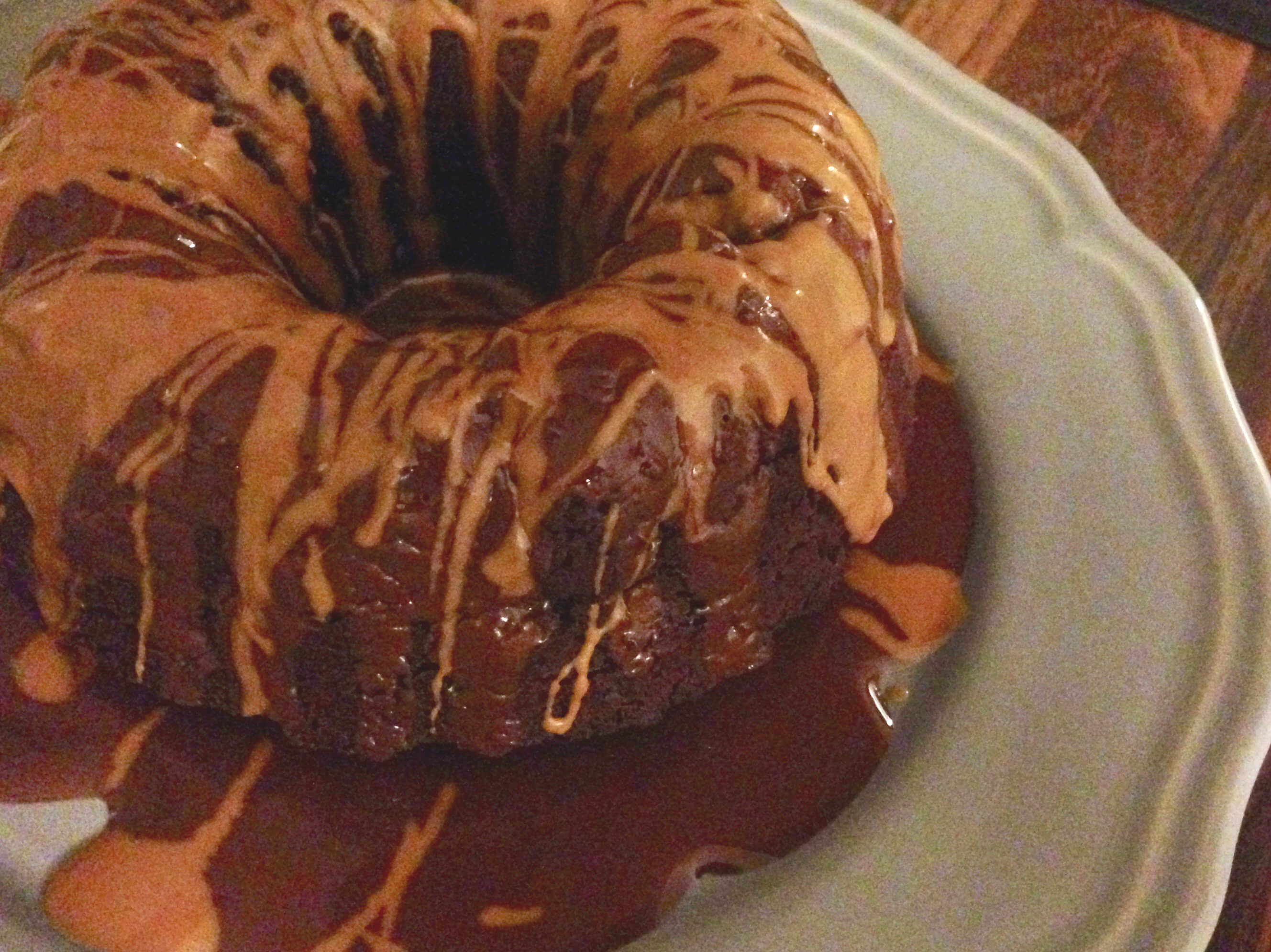 - Für die Glasur alle Zutaten gut miteinander vermischen bis eine schokoladenartige Konsistenz entsteht. Wenn zu flüssig etwas mehr Rohkakaopulver wenn zu fest mehr Öl. (Achtung wenn man mehr Rohkakao hinzugibt gleichzeitig auch mehr Agavendicksaft, da der Kakao leicht herb schmeckt.) Erdnussbutter leicht erwärmen und über den Gugelhupf gießen.