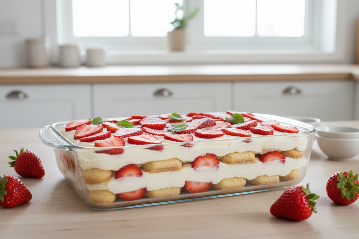 Wenn die ersten Erdbeeren auf den Markten erscheinen, ist dieses Erdbeer Tiramisu das Erste, das ich zubereite. Es braucht keine 20 Minuten aktive Vorbereitung - dann ubernimmt der Kuhlschrank. Das Ergebnis: eine cremige, fruchtige Nachspeise ohne Eier und ohne Milchprodukte, die bei Gaesten immer begeistert.