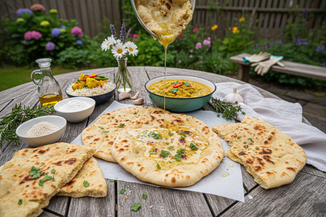 Im Gegensatz zu traditionellem Naan, das oft mit Joghurt und Ei zubereitet wird, verwenden wir hier Sojajoghurt und etwas mehr Hefe für die perfekte Textur. Das Ergebnis: unglaublich weiches, leicht süßliches Fladenbrot mit den charakteristischen Blasen und goldbraunen Stellen.