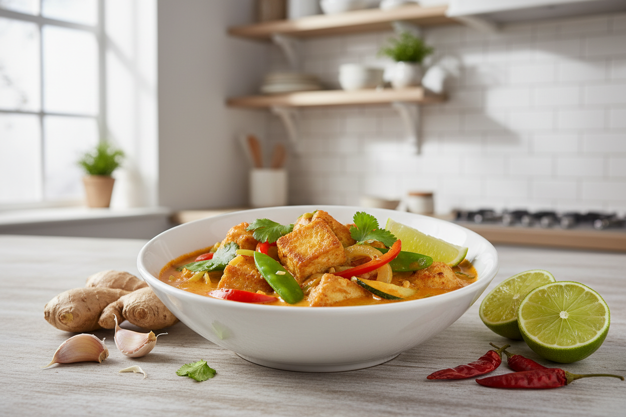 Veganes Rotes Thai Curry gehört zu den aromatischsten Gerichten der asiatischen Küche: cremige Kokosmilch, kräftige Currypaste und knuspriger Tofu verbinden sich in 35 Minuten zu einem Gericht, das begeistert. Das Geheimnis liegt im Anrösten der Currypaste - dieser kurze Schritt baut eine Tiefe auf, die das Curry von einem einfachen Eintopf zu einem echten Geschmackserlebnis macht.