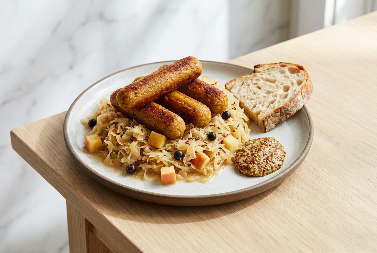 Tipp: Vegane Bratwurst-Würstel haben genug Eigengeschmack, um neben dem kräftigen Sauerkraut zu bestehen.