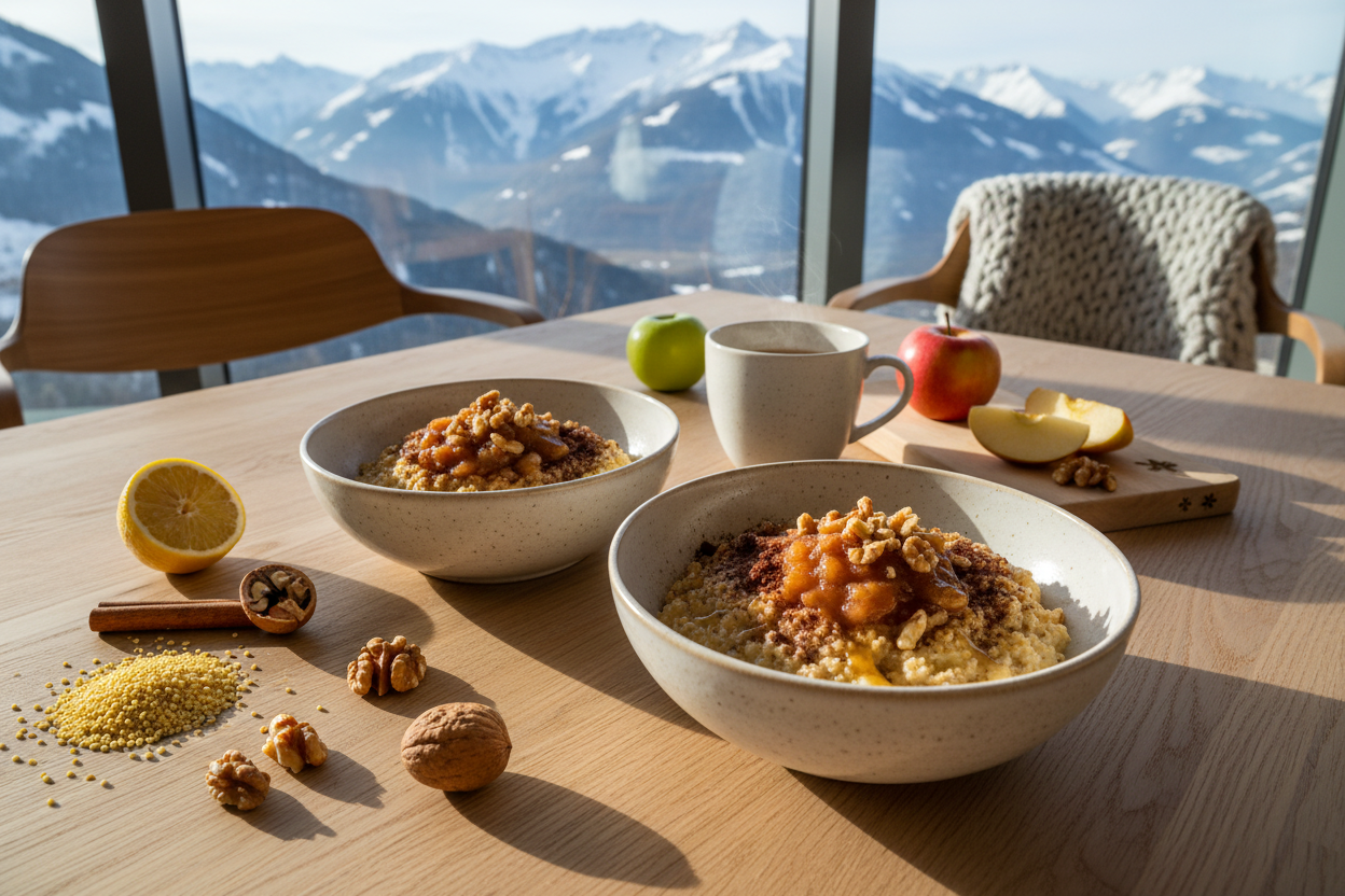 Hirse ist ein unterschätztes Pseudogetreide, das glutenfrei und reich an Eisen, Magnesium und B-Vitaminen ist. Kombiniert mit Walnüssen für gesunde Omega-3-Fettsäuren und frischem Apfelkompott ergibt sich ein perfektes Winterfrühstück.