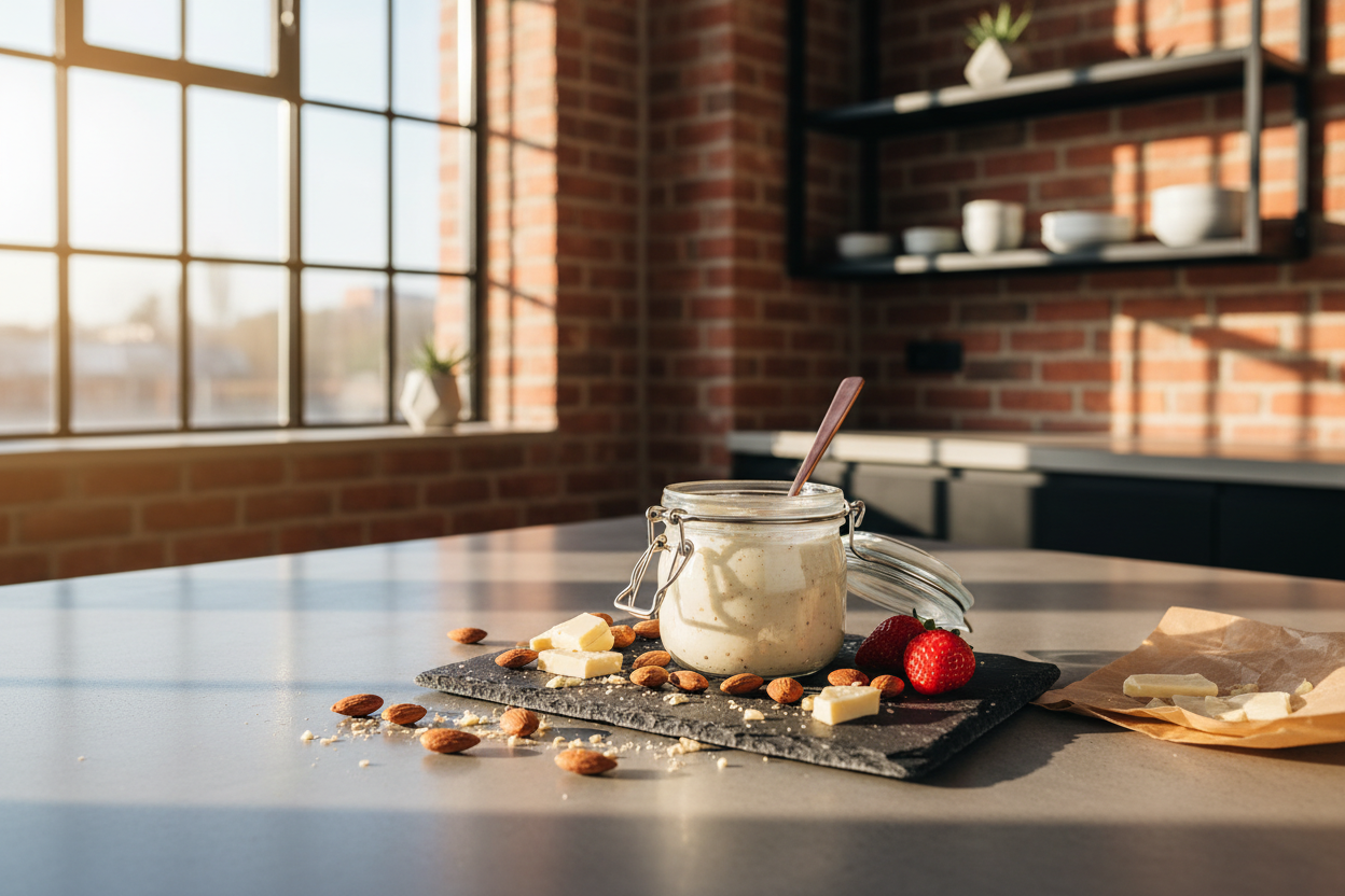 Dieses weiße Mandel-Schoko-Pesto ist mehr als ein gewöhnlicher Brotaufstrich: Geröstete blanchierte Mandeln geben ihm eine nussige Tiefe, während vegane weiße Schokolade und Hafersahne für eine samtig-cremige Textur sorgen. Das Ergebnis ist intensiv, süß und dabei überraschend vielseitig - ob morgens auf Dinkeltoast, als Dip für frische Erdbeeren oder als Schicht in einem Dessert.