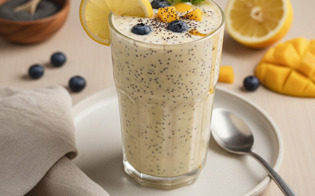 - Sojamilch mit Zitronensaft und ev. Süßungsmittel und weiteren Früchten mixen, in ein Glas füllen, Mohn obendraufgeben, Füße hochlegen und genießen!