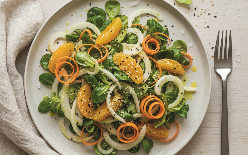 Fröhlicher Veganer Zitrus-Fenchel-Feldsalat